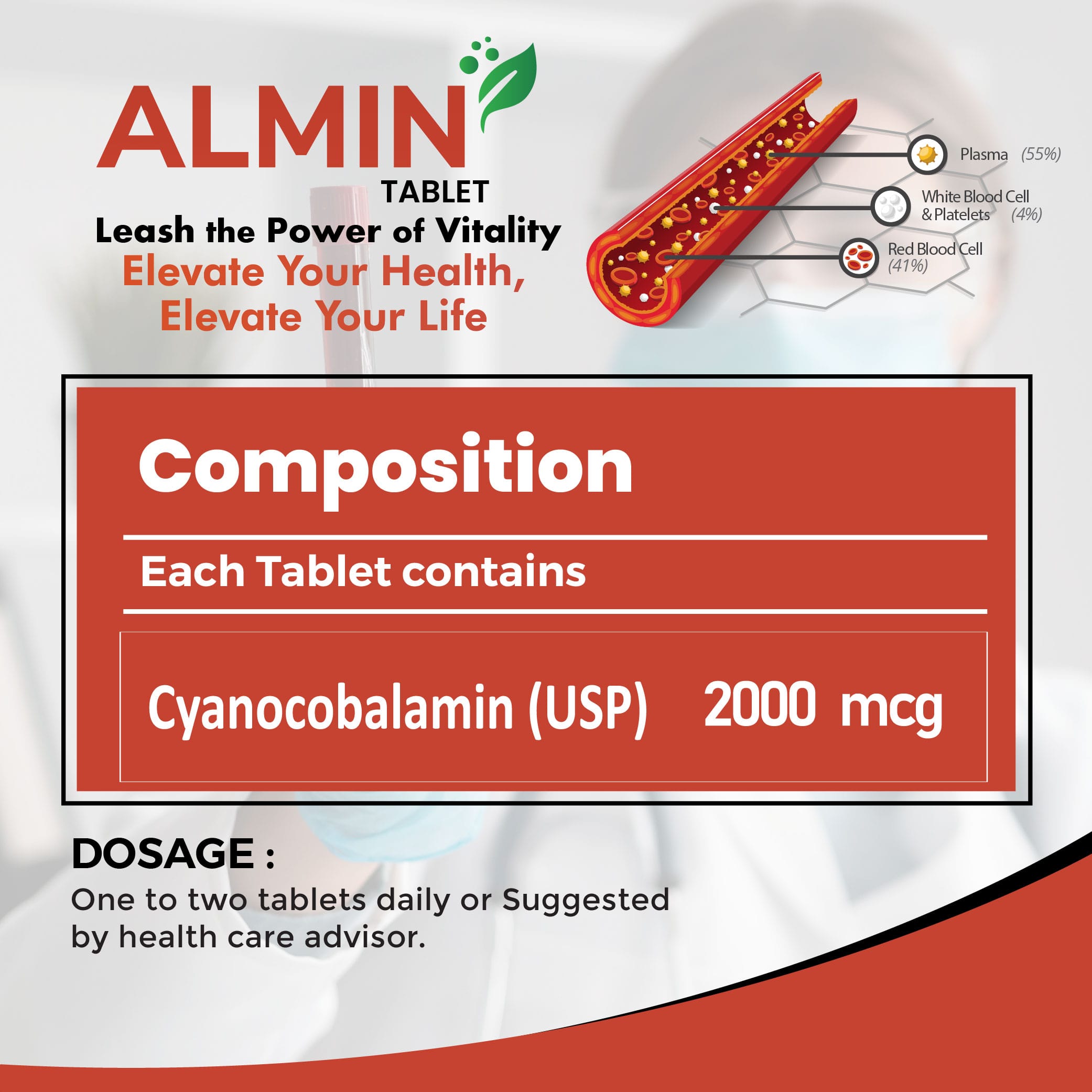 ALMIN TABLET provides a concentrated dose of Cyanocobalamin, a form of vitamin B12 crucial for various bodily functions, ensuring overall health and well-being.