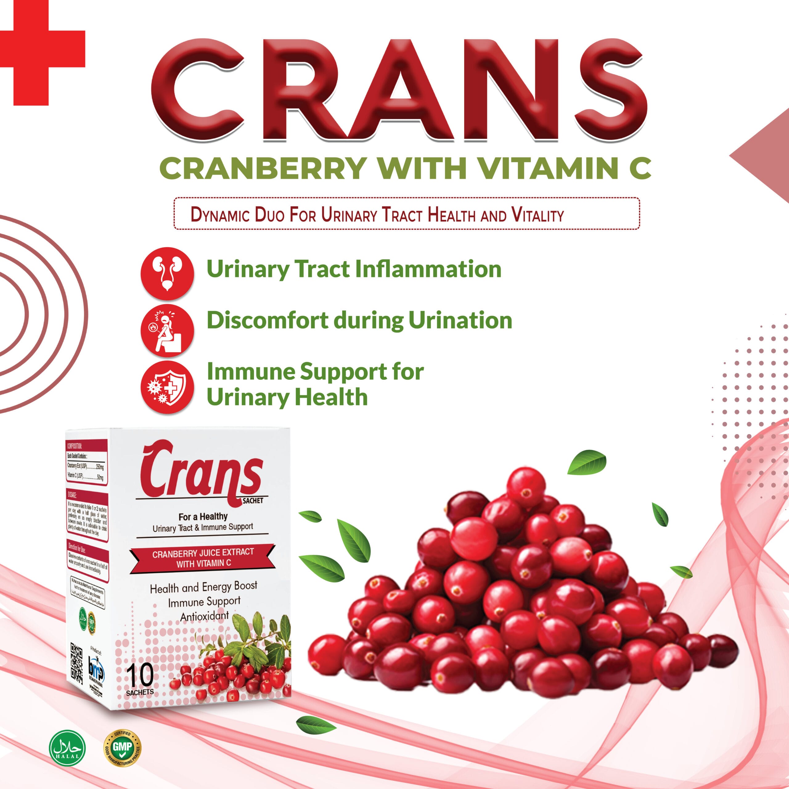 CRANS SACHET utilizes the natural properties of Cranberry Extract, known for its potential benefits for urinary health. Vitamin C complements the formula by boosting the immune system.