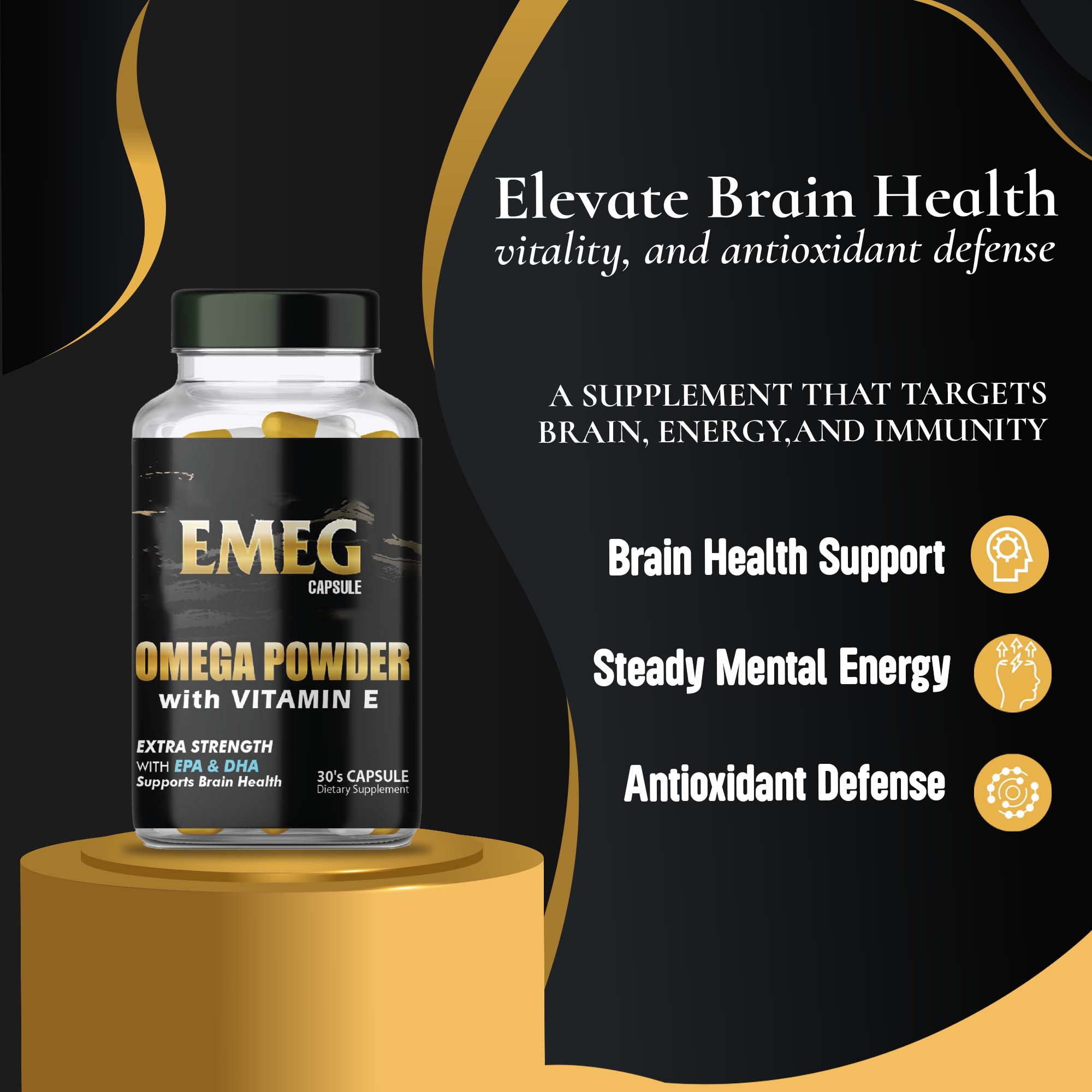 Emeg Capsule combines Omega-3 fatty acids and Vitamin E to support brain health, enhance mental energy, and provide antioxidant protection, helping improve cognitive function, immunity, and overall wellness in a convenient daily supplement.