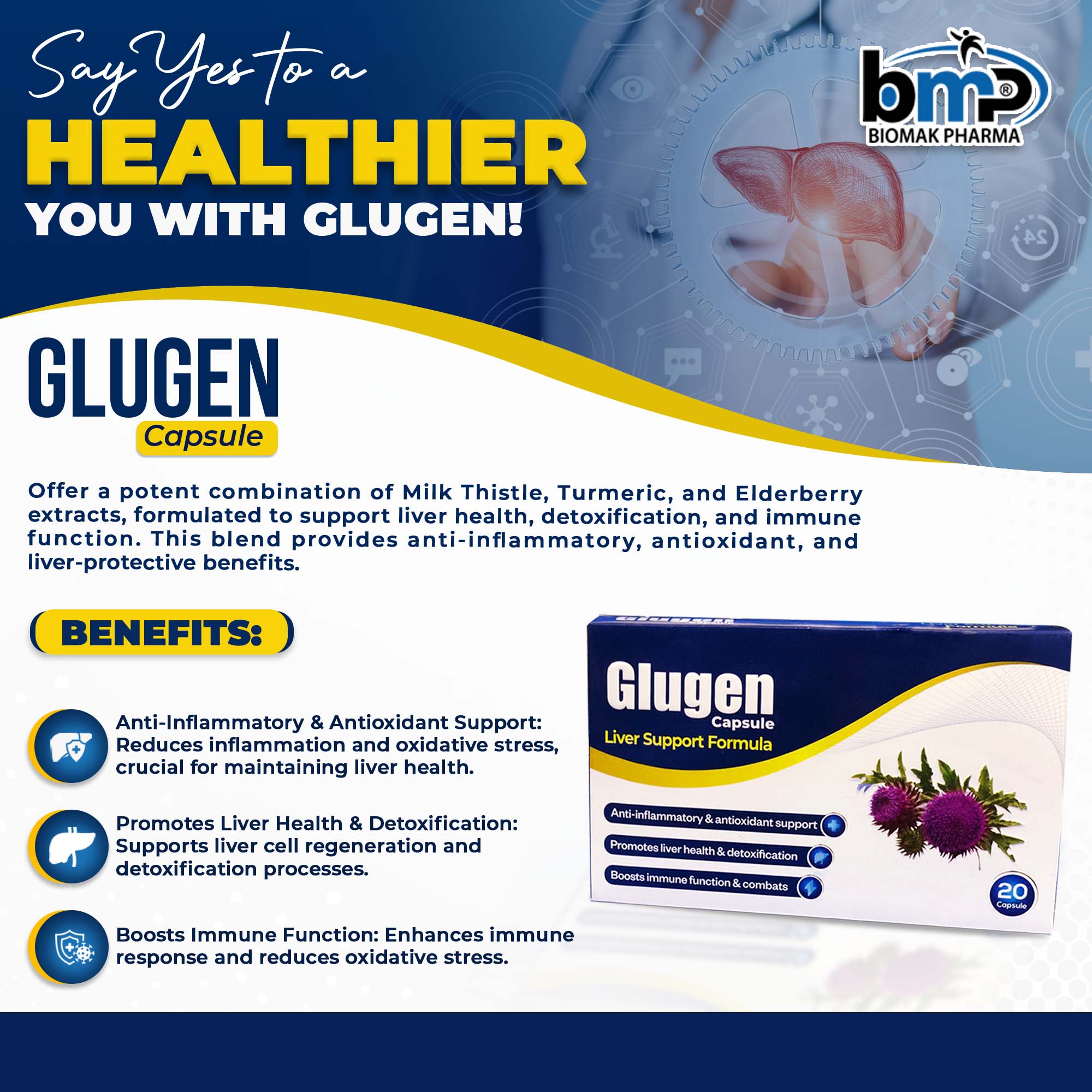 Glugen Capsule is a liver support formula designed to promote liver health, assist detoxification, reduce inflammation, and provide antioxidant support while helping boost immune function for overall wellness.