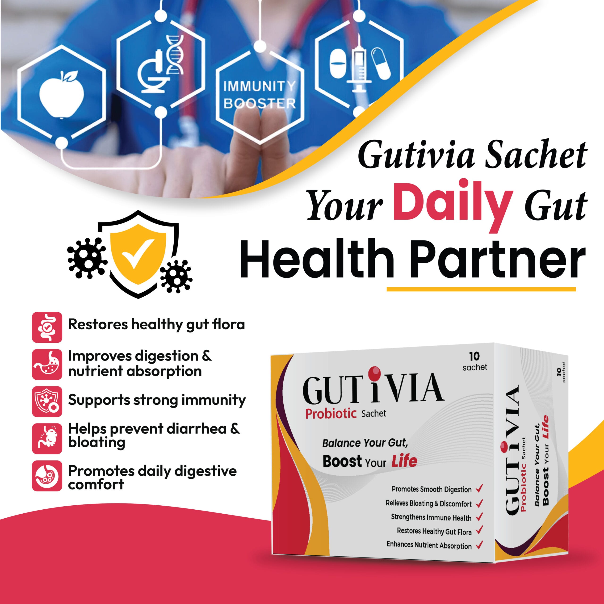 GUTVIA Probiotic Sachet supports healthy digestion, boosts immunity, restores gut balance after antibiotics, reduces bloating and diarrhea, and enhances nutrient absorption for overall digestive wellness and daily gut health support.