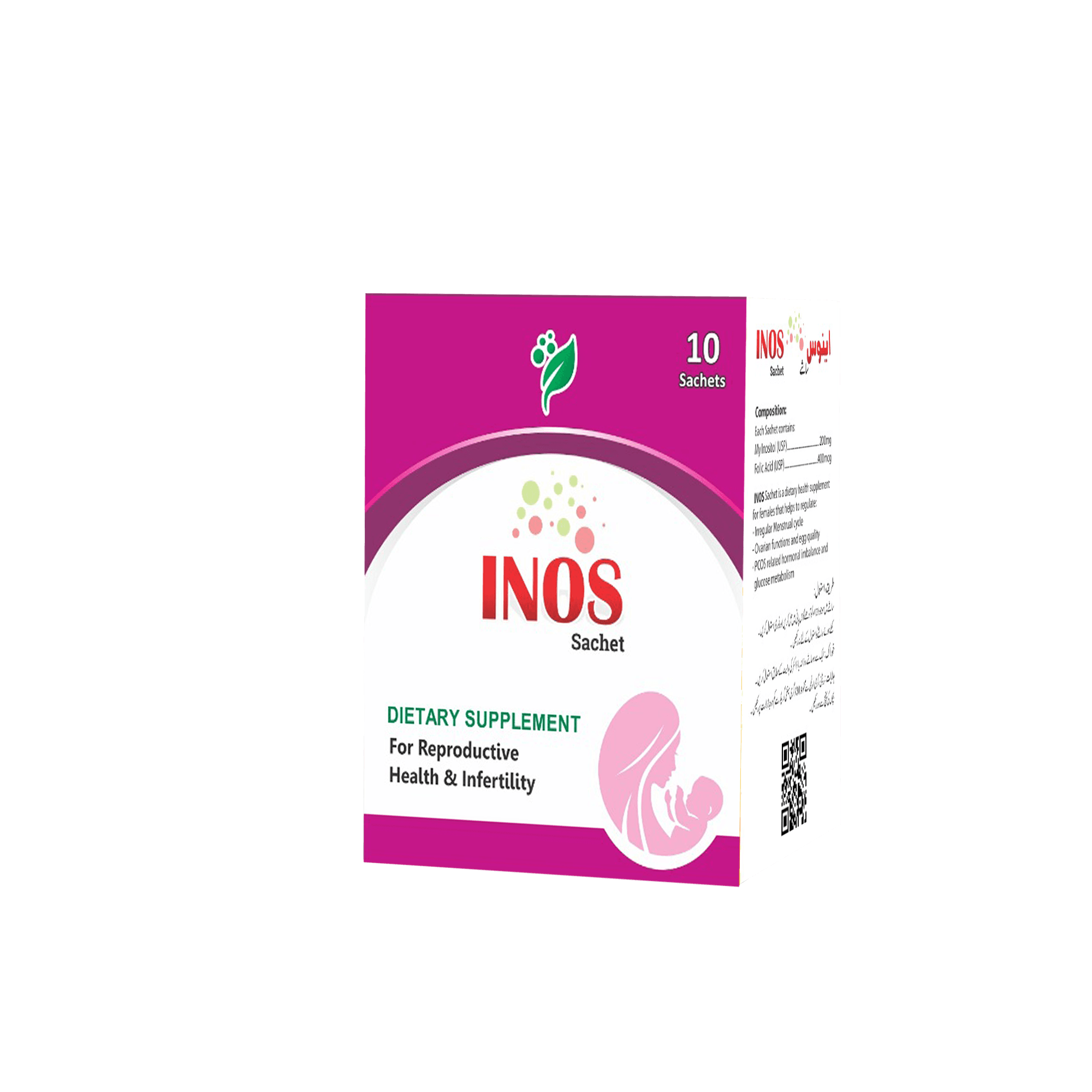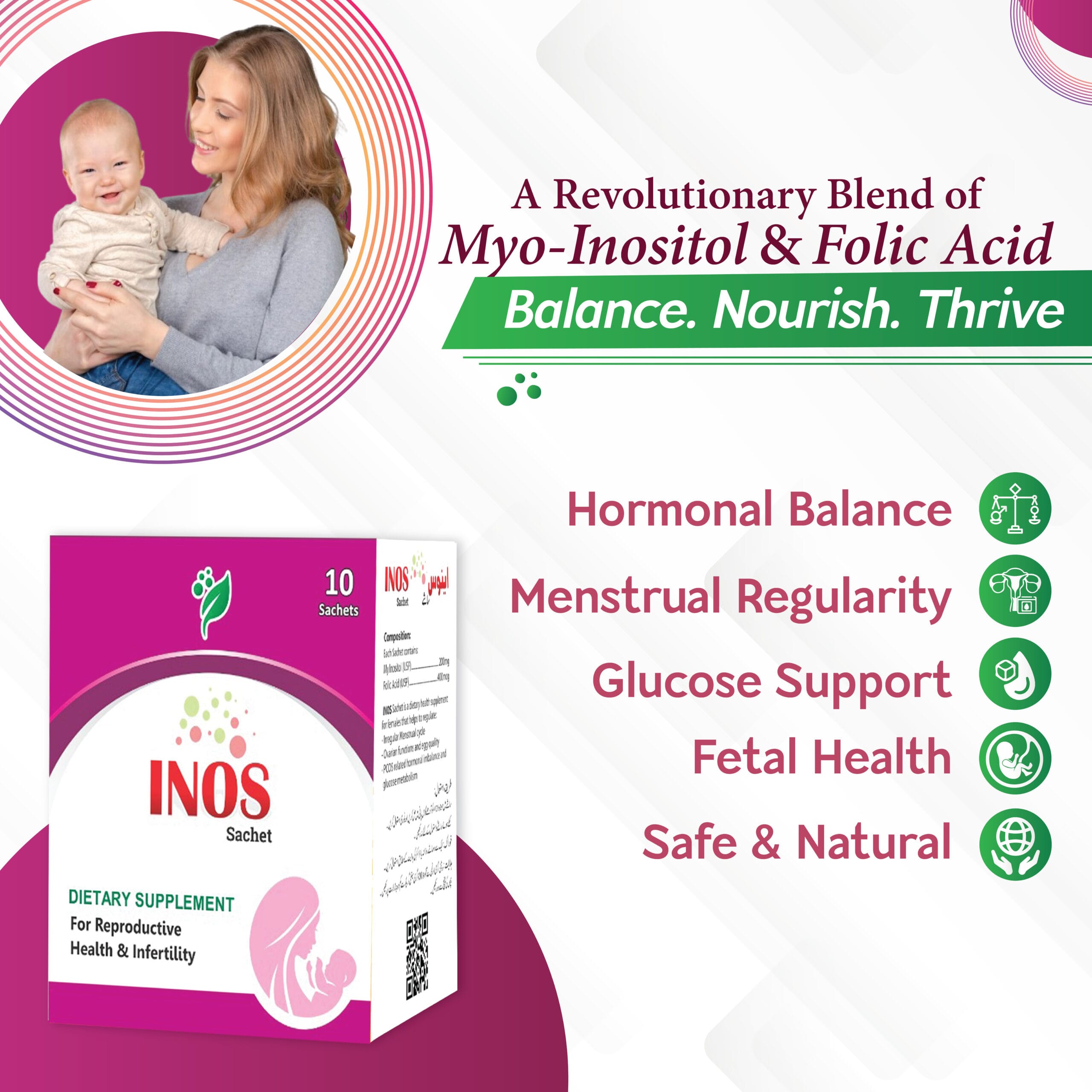 Inos Sachets combine 2000 mg Myo-Inositol and 400 mcg Folic Acid to support hormonal balance, menstrual regularity, ovarian function, and reproductive health, while aiding prenatal wellness and healthy fetal development naturally.