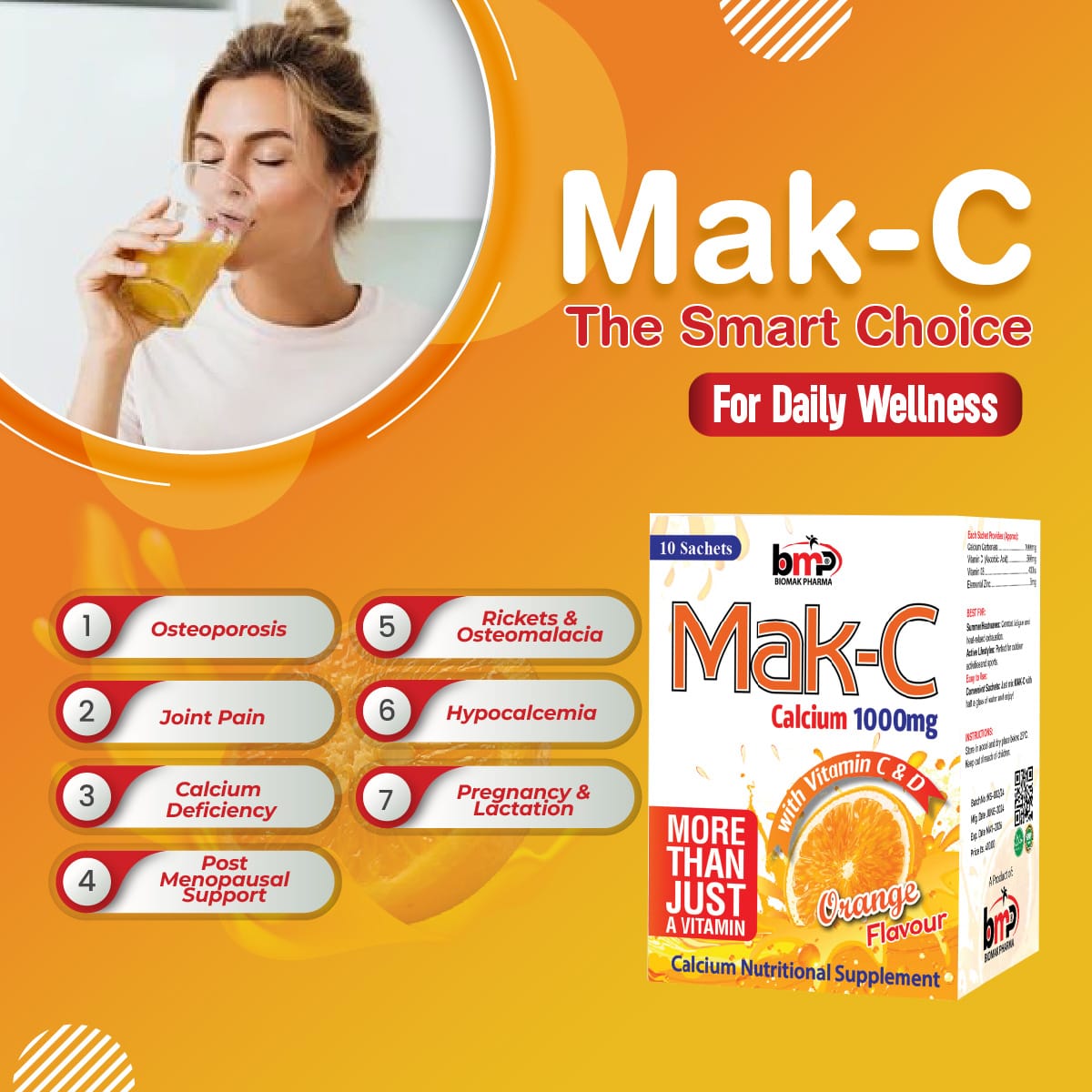 MAK C Sachets are a comprehensive calcium nutritional supplement formulated to strengthen bones, support joint cartilage, and improve skeletal health. Each sachet contains Calcium carbonate, Vitamin C, Vitamin D3, and Elemental Zinc, ensuring optimal calcium delivery to bones while keeping arteries clear. The effervescent honeycomb-like structure enhances absorption, promoting bone mass improvement and density. Vitamin C supports immune function and overall well-being, while Vitamin D3 aids calcium absorption. Ideal for calcium deficiency, post-menopausal support, and active lifestyles, MAK C Sachets are perfect for combating heat-related fatigue and supporting bone health, joint function, and vitality daily.