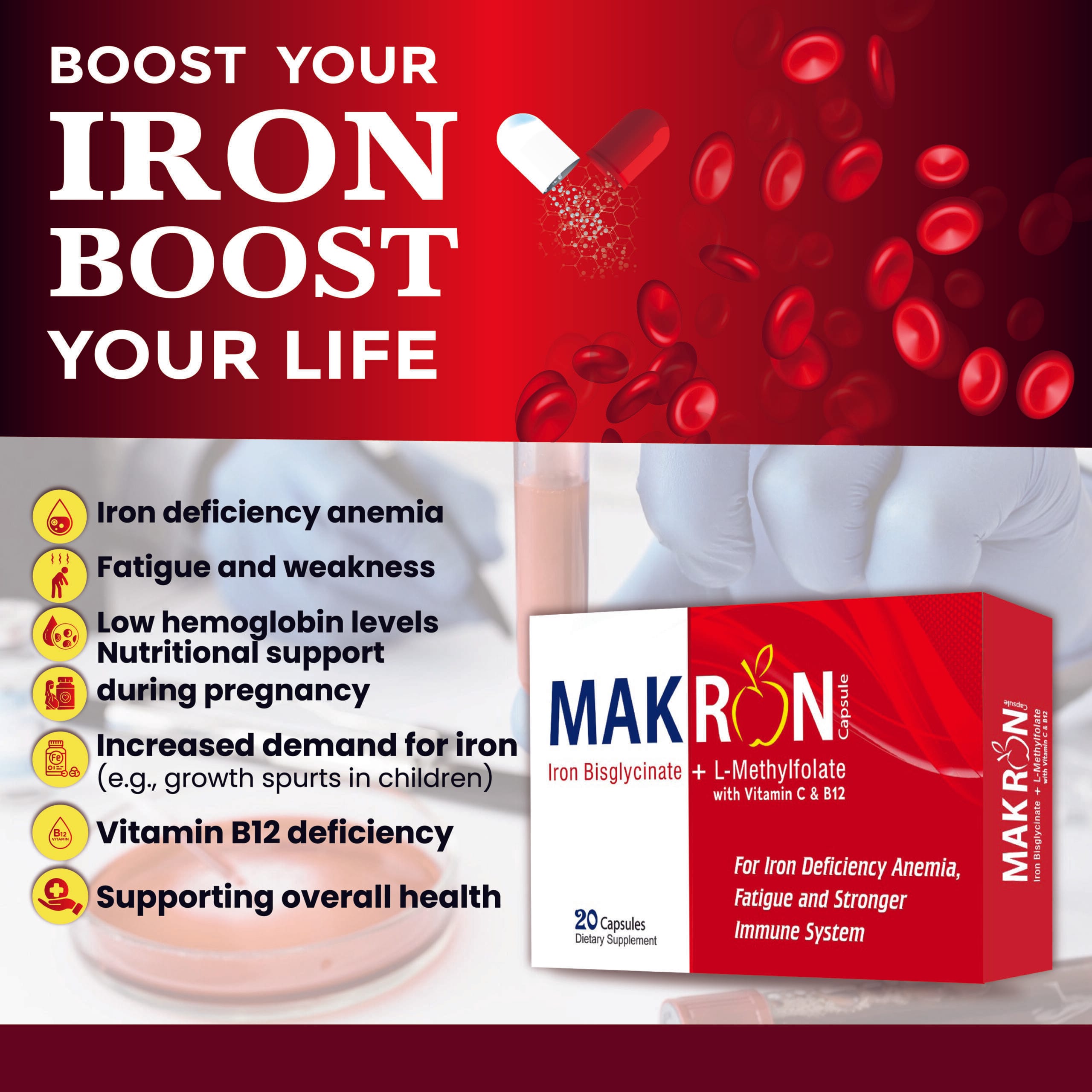 MAKRON CAPSULE combines the benefits of iron, L-methyl folate, Vitamin C, and Vitamin B12 to provide comprehensive support for iron deficiency, fatigue, and immune strength.