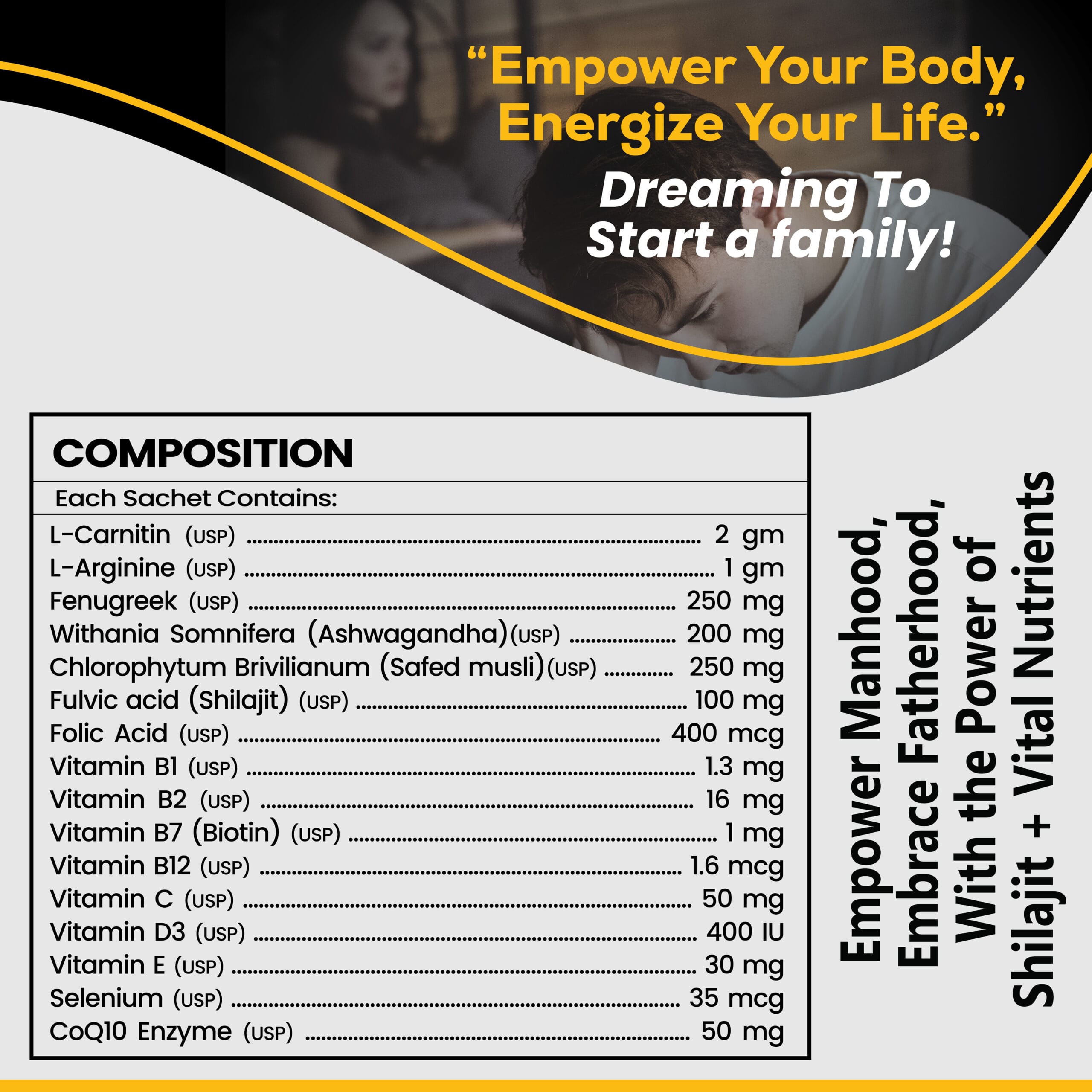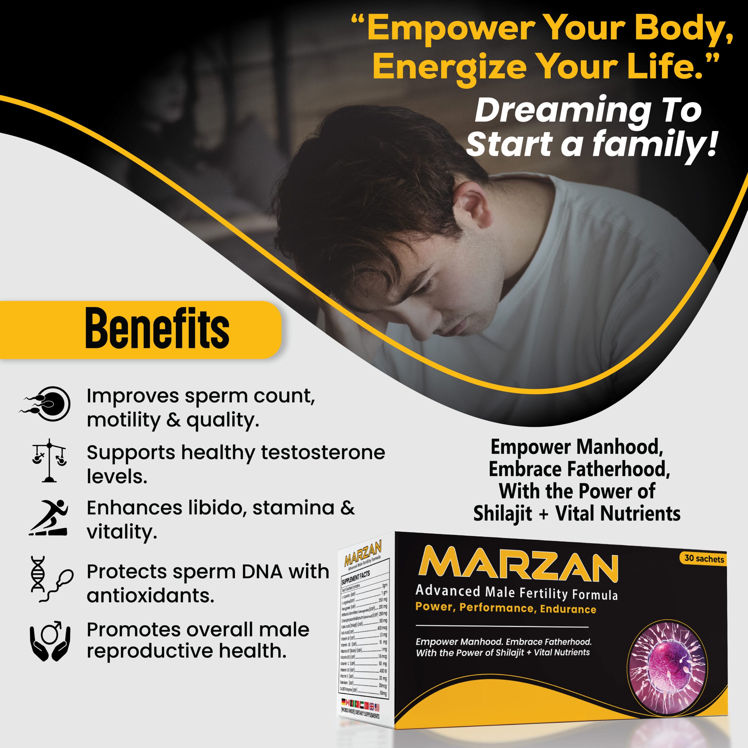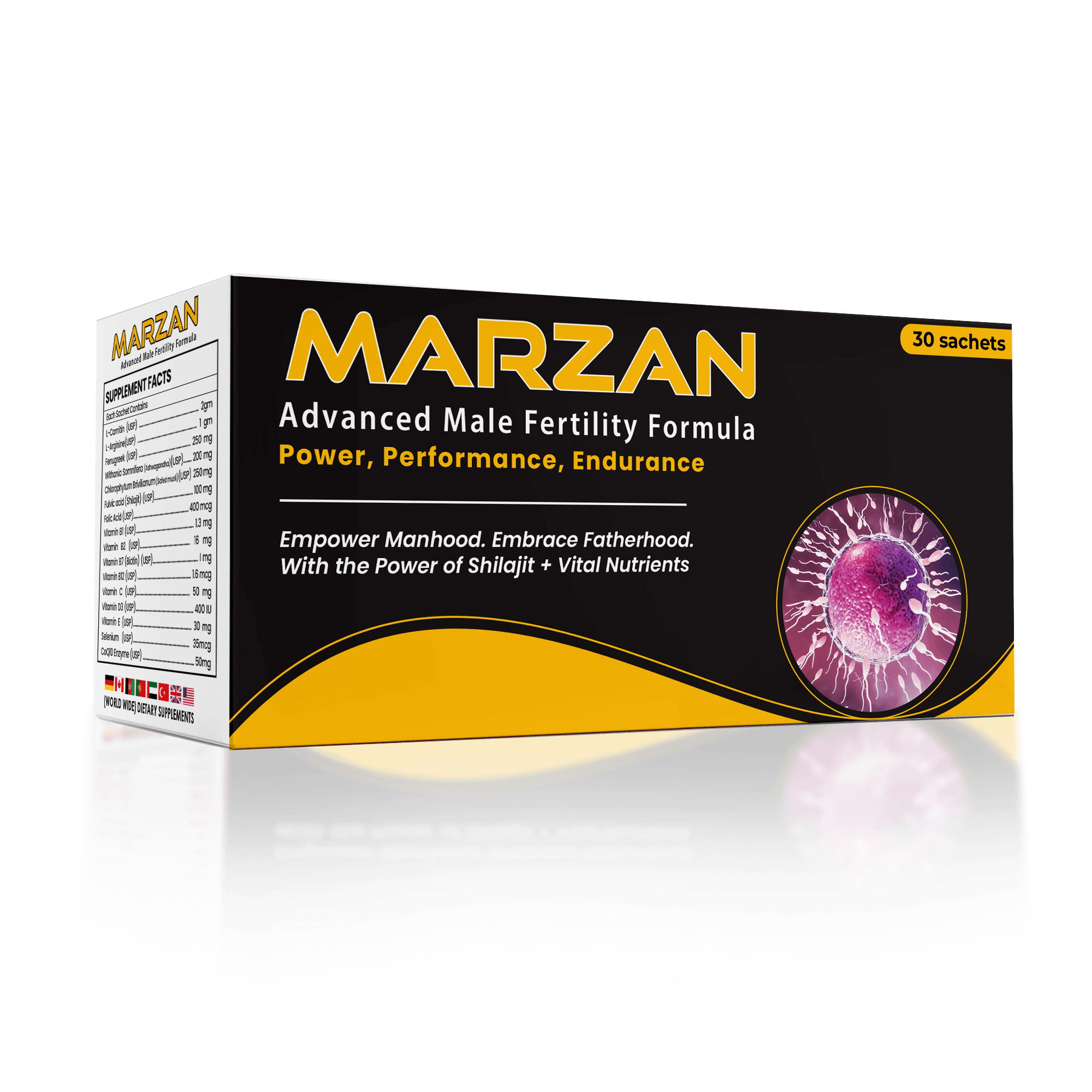 Marzan contains L-Carnitine, L-Arginine, Fenugreek, Ashwagandha, Safed Musli, Shilajit, CoQ10, vitamins, and minerals that support energy production, immunity, hormonal balance, and metabolic health effectively.