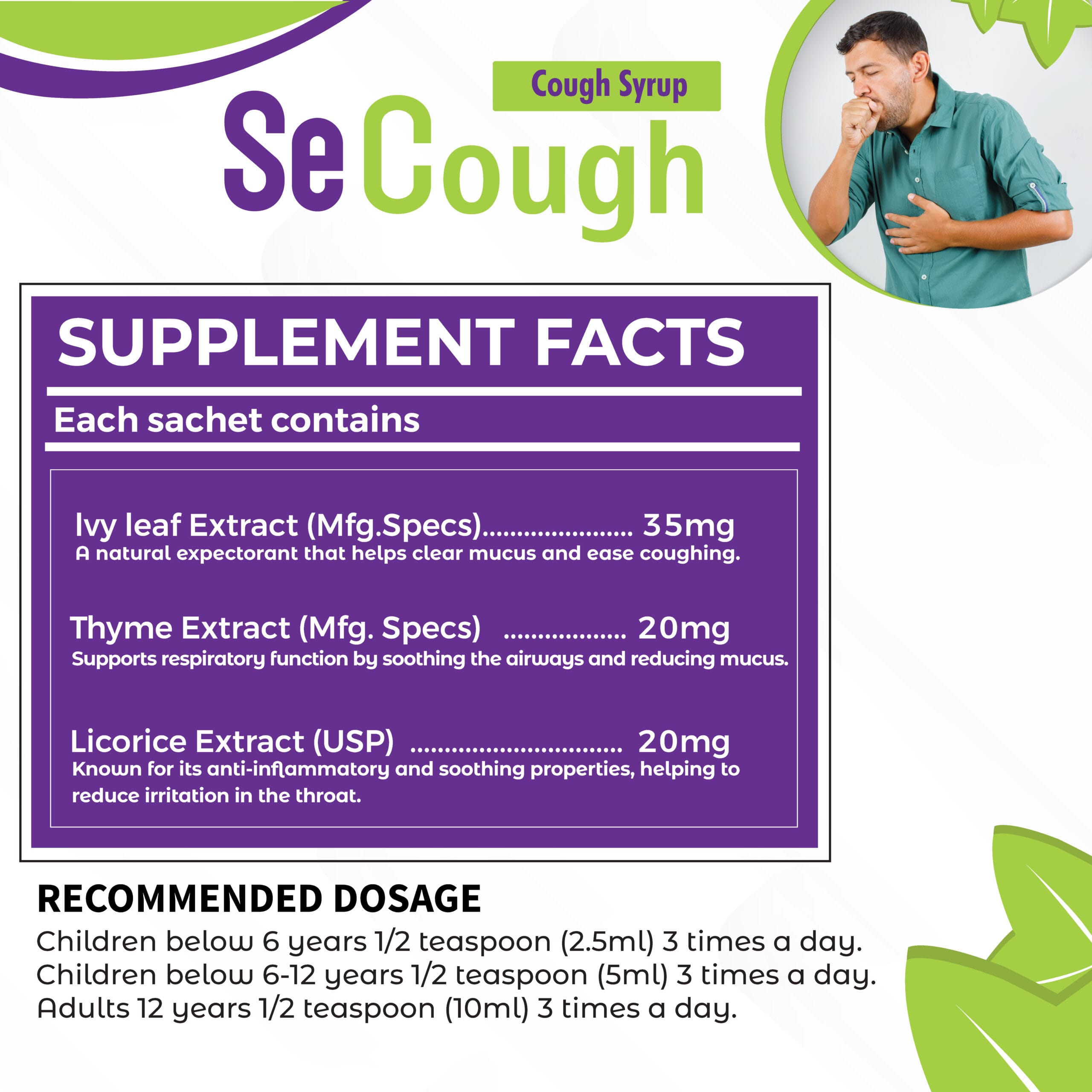 Secough Syrup is a natural herbal cough formulation designed to relieve cough, soothe throat irritation, and support respiratory health. It uses Ivy Leaf, Thyme, and Licorice extracts to help clear mucus and improve breathing comfort without causing drowsiness or added sugar. It is suitable for daytime use and supports relief from bronchial congestion and cough associated with minor respiratory infections. Dosed according to age, it provides gentle expectorant action for children and adults while remaining non-drowsy and sugar-free for everyday respiratory care. Regular use helps maintain clear airways and reduces discomfort caused by excess mucus buildup. Safe effective daily relief