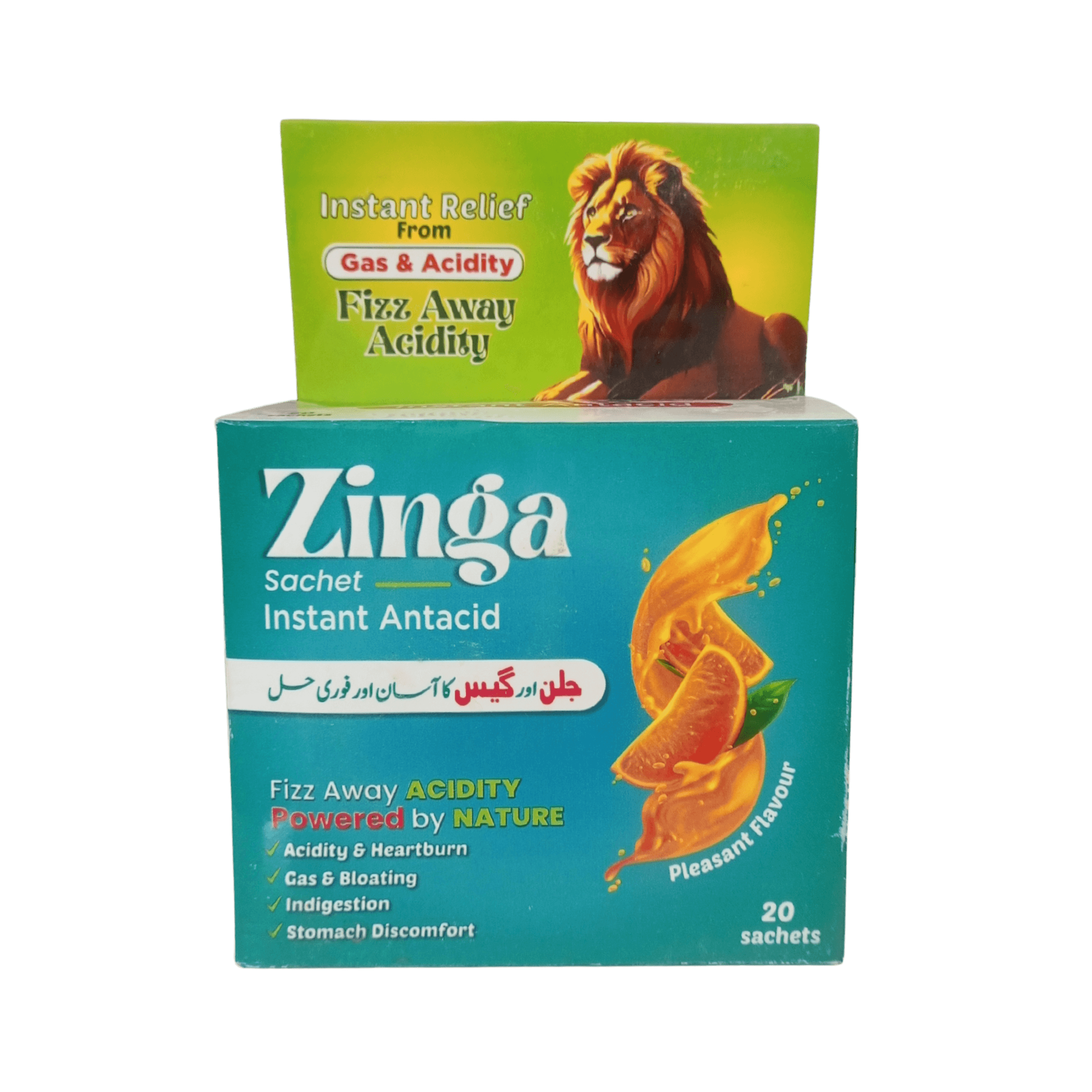Zinga Sachet is an instant antacid formulation combining calcium, ginger, peppermint, and potassium bicarbonate to relieve gas, acidity, and bloating while supporting smooth digestion, balanced stomach pH, and overall digestive comfort.